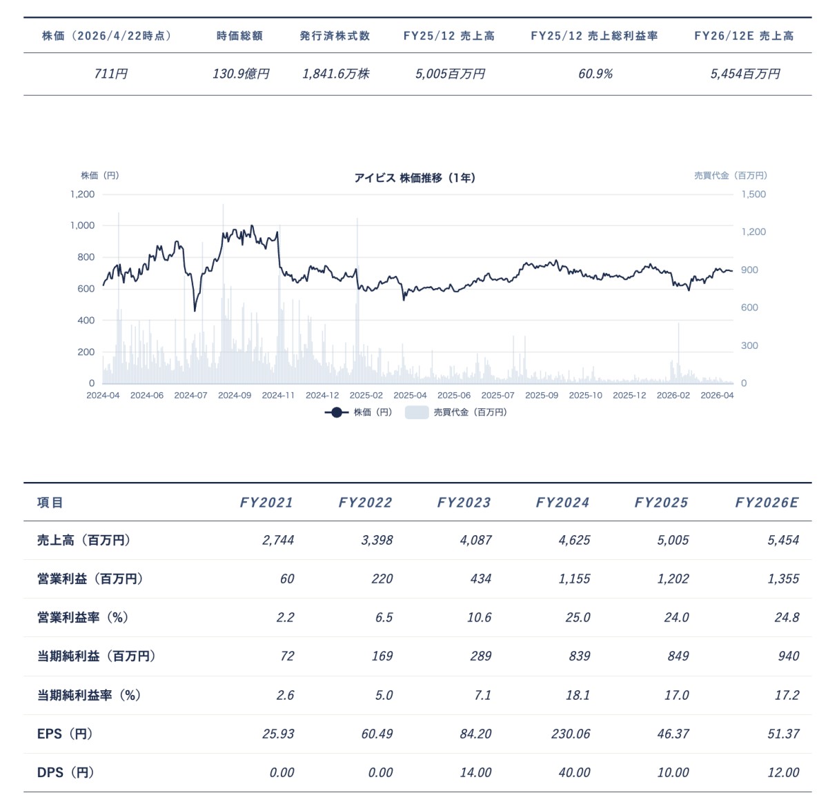 基本プロフィールを押さえると、商号は株式会社アイビス、代表者は神谷栄治氏、設立は2000年5月11日、上場は2023年3月23日の東証グロース市場、決算日は12月末日だ。2025年12月期の連結業績は、売上高5,005百万円、営業利益1,201百万円、経常利益1,215百万円、親会社株主に帰属する当期純利益848百万円で、総資産は4,187百万円、純資産は2,899百万円、自己資本比率は67.8%となった。